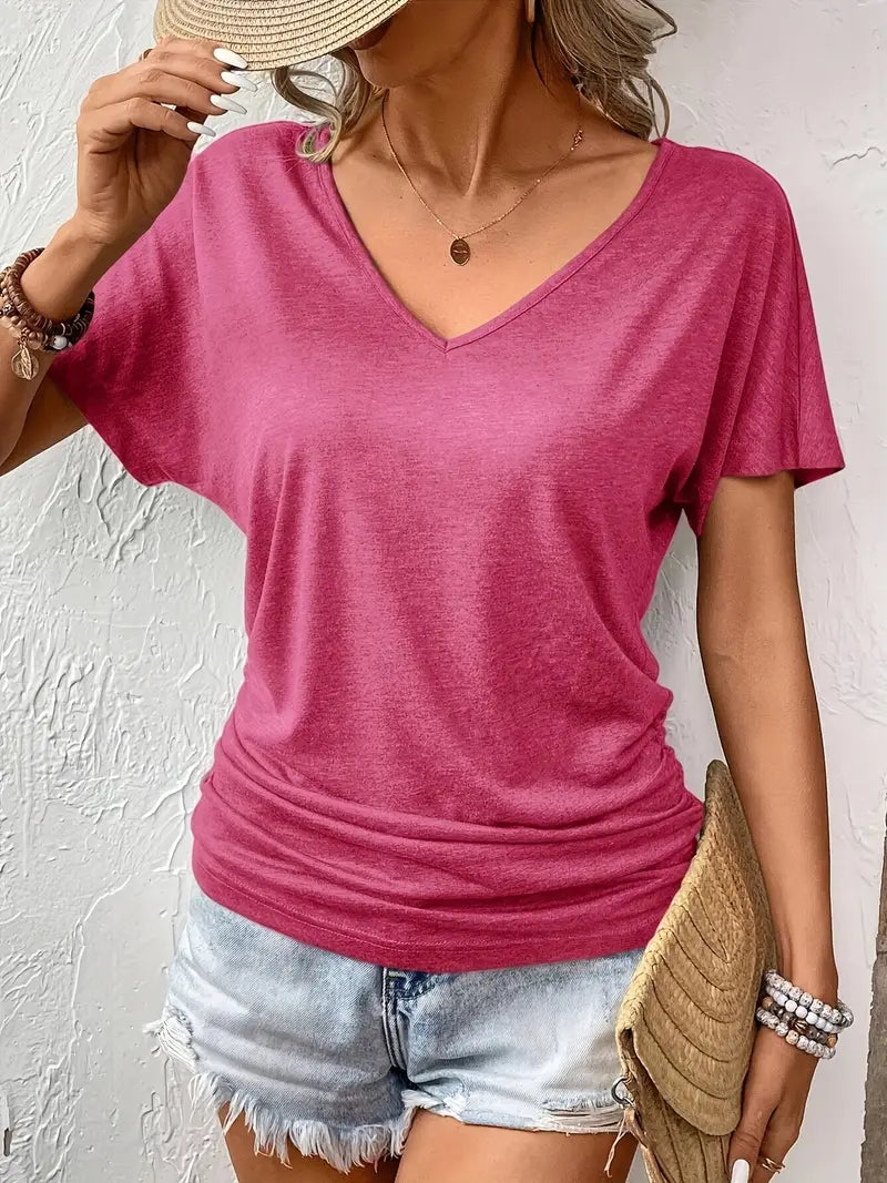 Solid Colour V-Neck Short Sleeve Pleated T-Shirt , Waist Wrinkle Curve