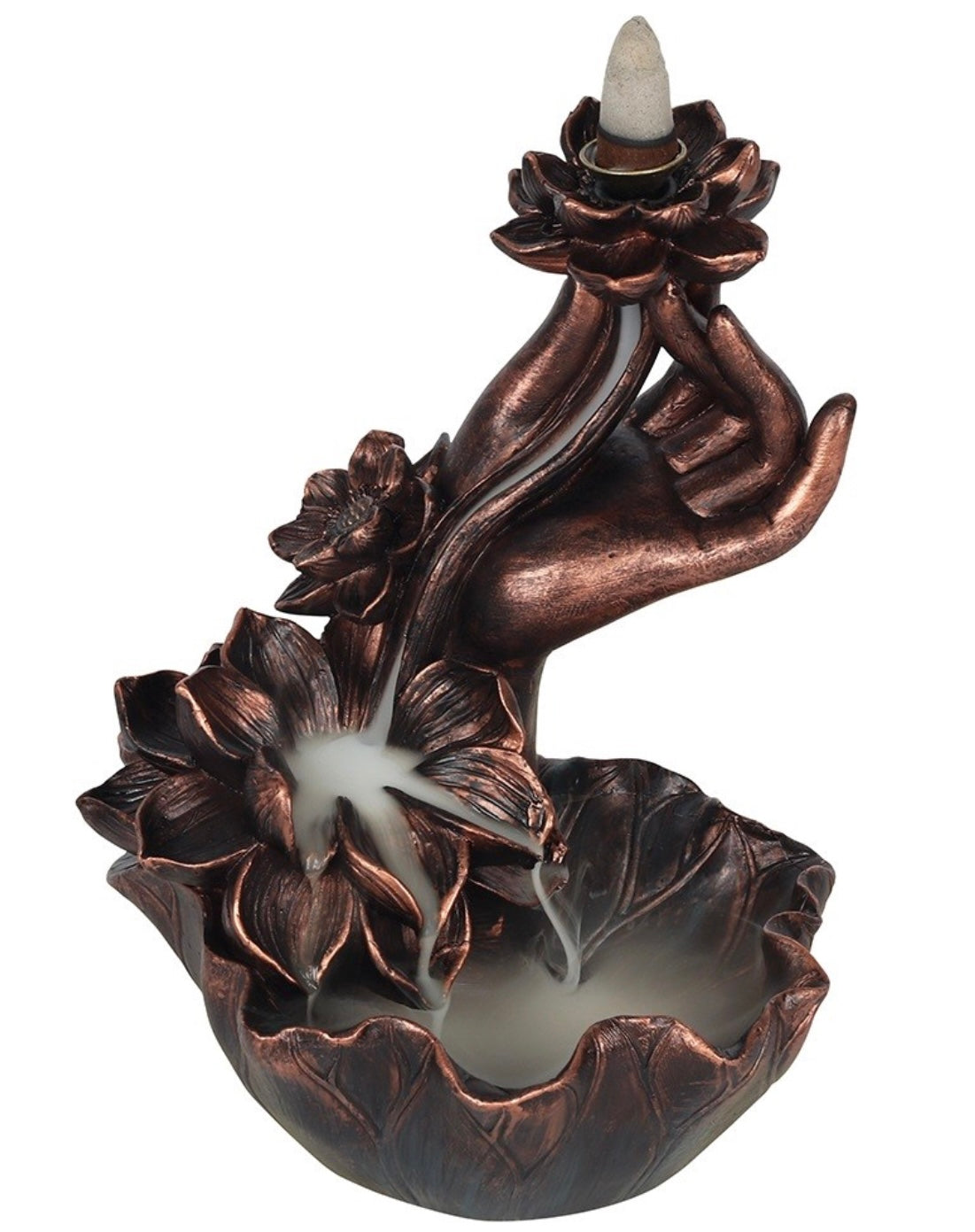 Discover the mesmerizing magic of this stunning bronze effect backflow incense burner! Featuring an elegant hand cradling a delicate flower design, it's a conversation starter that transforms your space into a sanctuary of calm. Simply pop a backflow cone on top and prepare to be enchanted as aromatic smoke cascades gracefully down the stem, pooling around the lower bloom like a mystical waterfall. The sophisticated bronze finish adds a touch of luxury to any room, whether you're into meditation, yoga, or just fancy creating some seriously Instagram-worthy vibes. Includes free incense cones to get you started on your aromatic journey. Perfect for creating that zen atmosphere you've been craving!