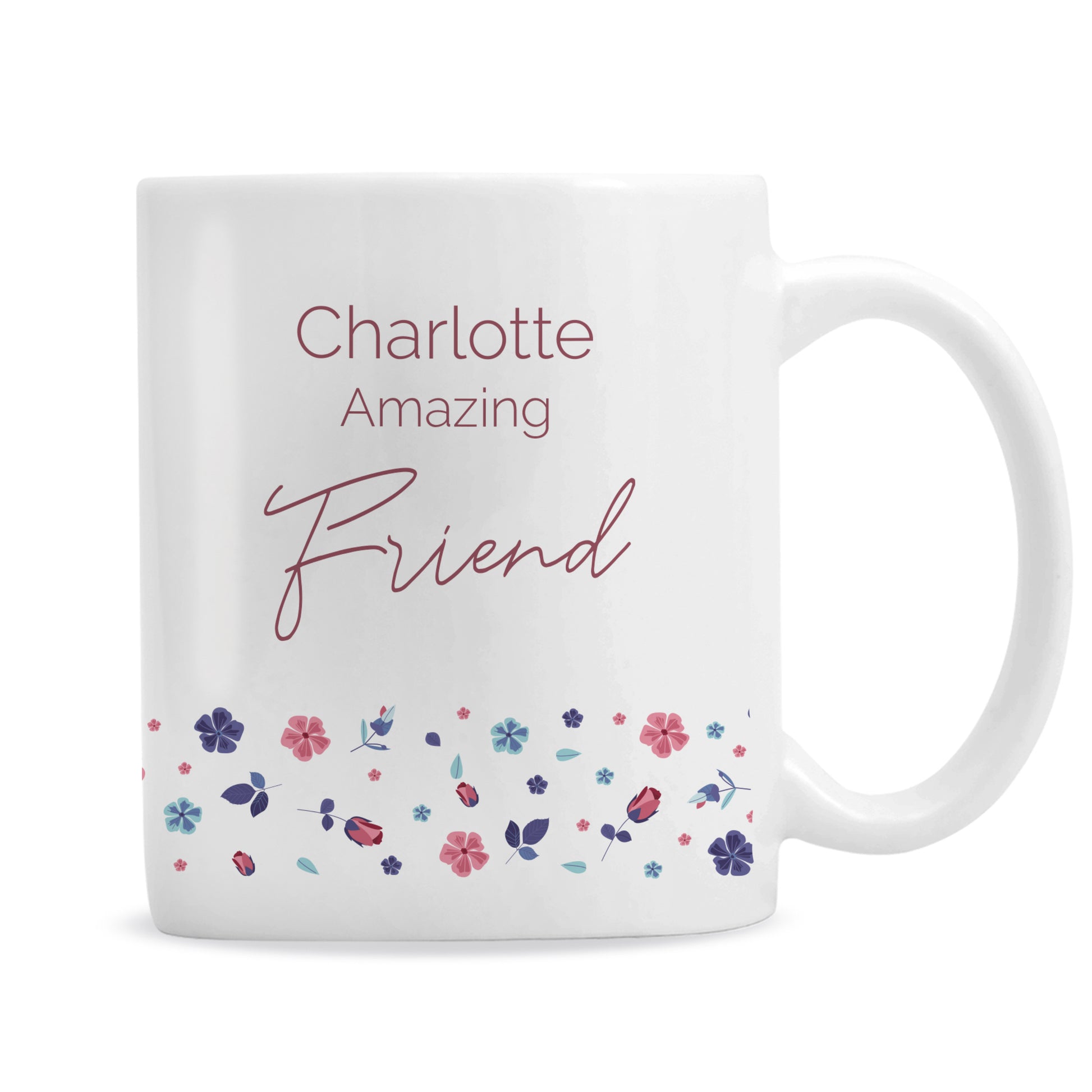Personalise this floral mug with your loved one's title using a maximum of 15 characters, this will appear below the fixed text 'Amazing'.