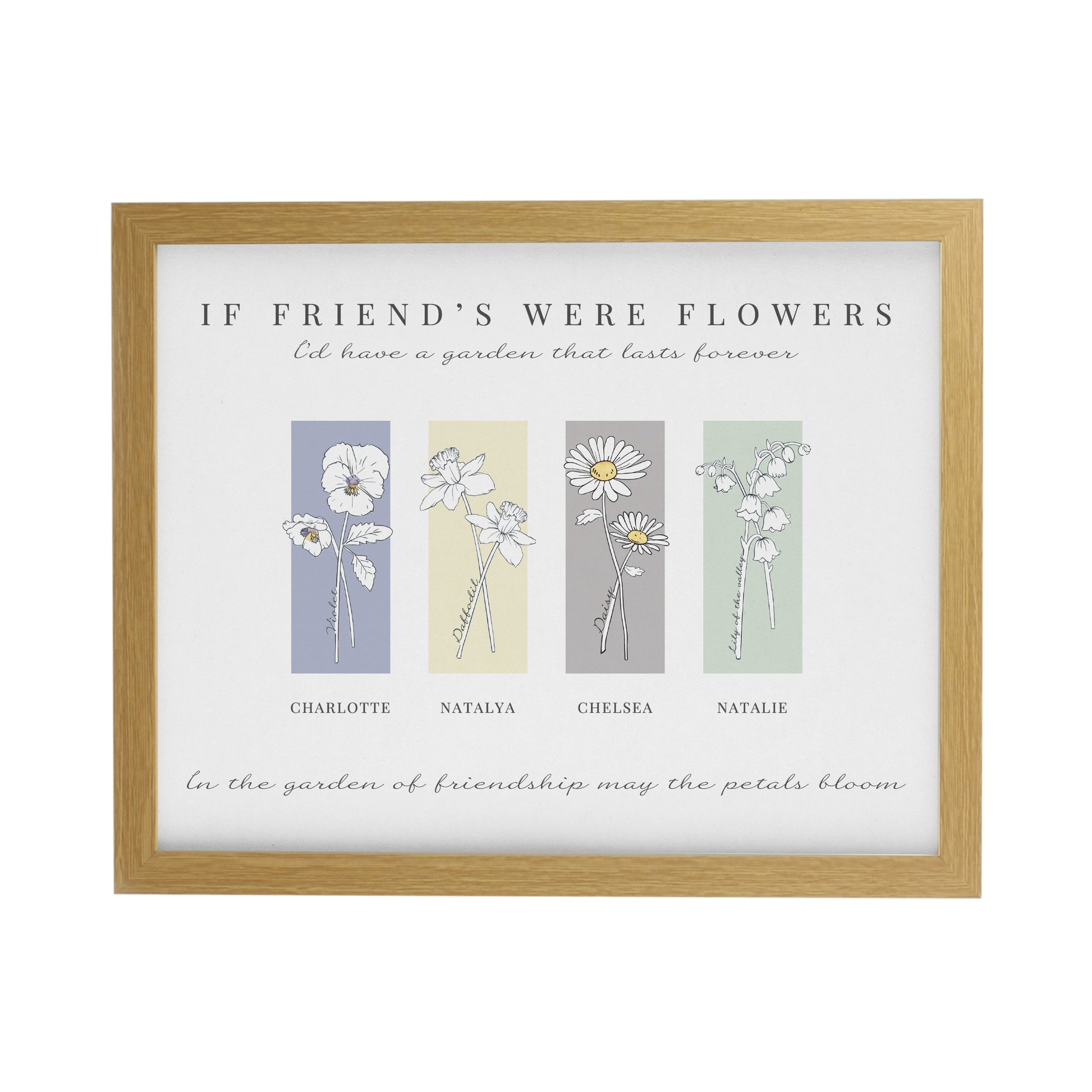 This unique framed print can be personalised with 2 message lines along the top, 4 flowers below, each with a name underneath and finally a message underneath of up to 50 characters.