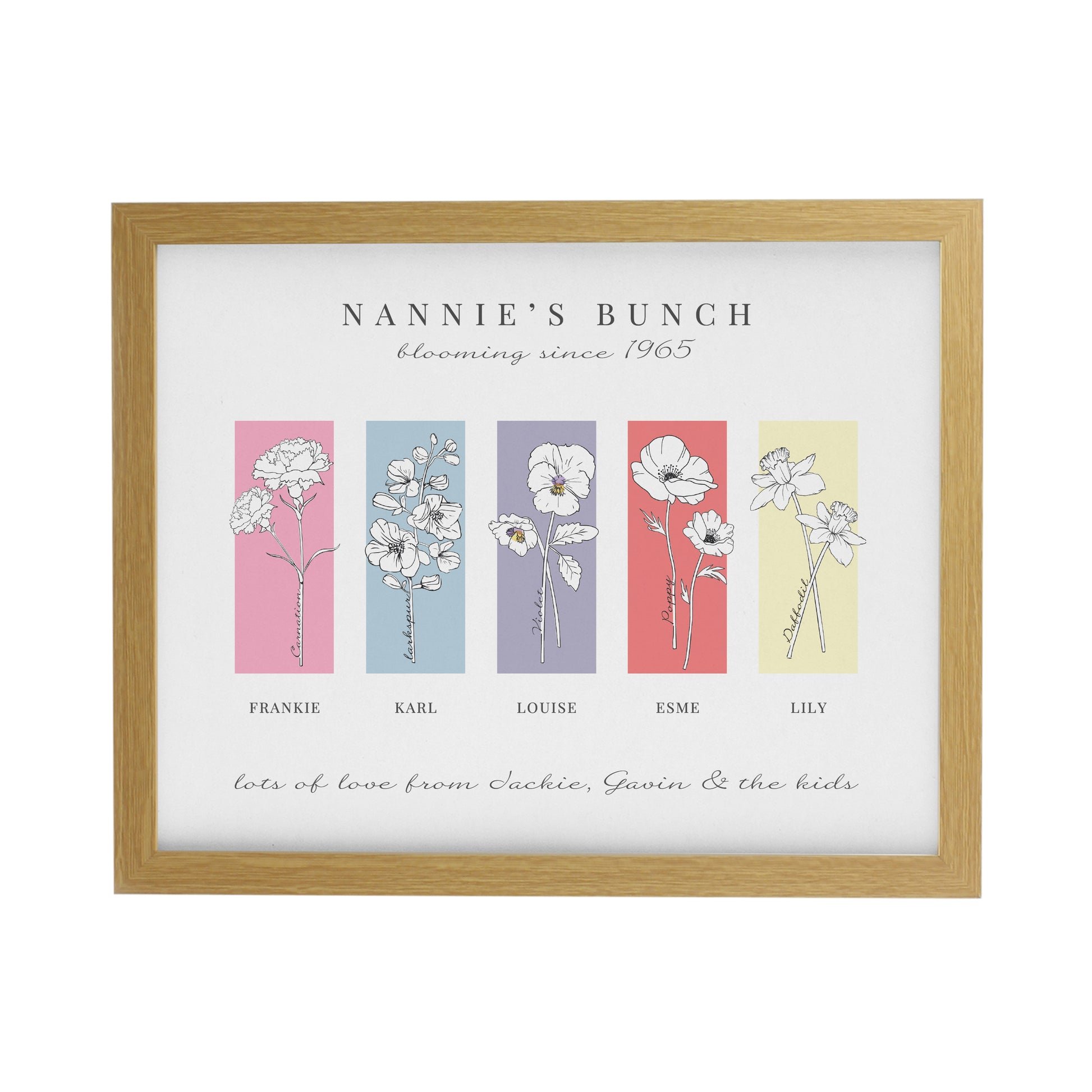 Personalised Birth Flower Family of 5 Oak Framed Print