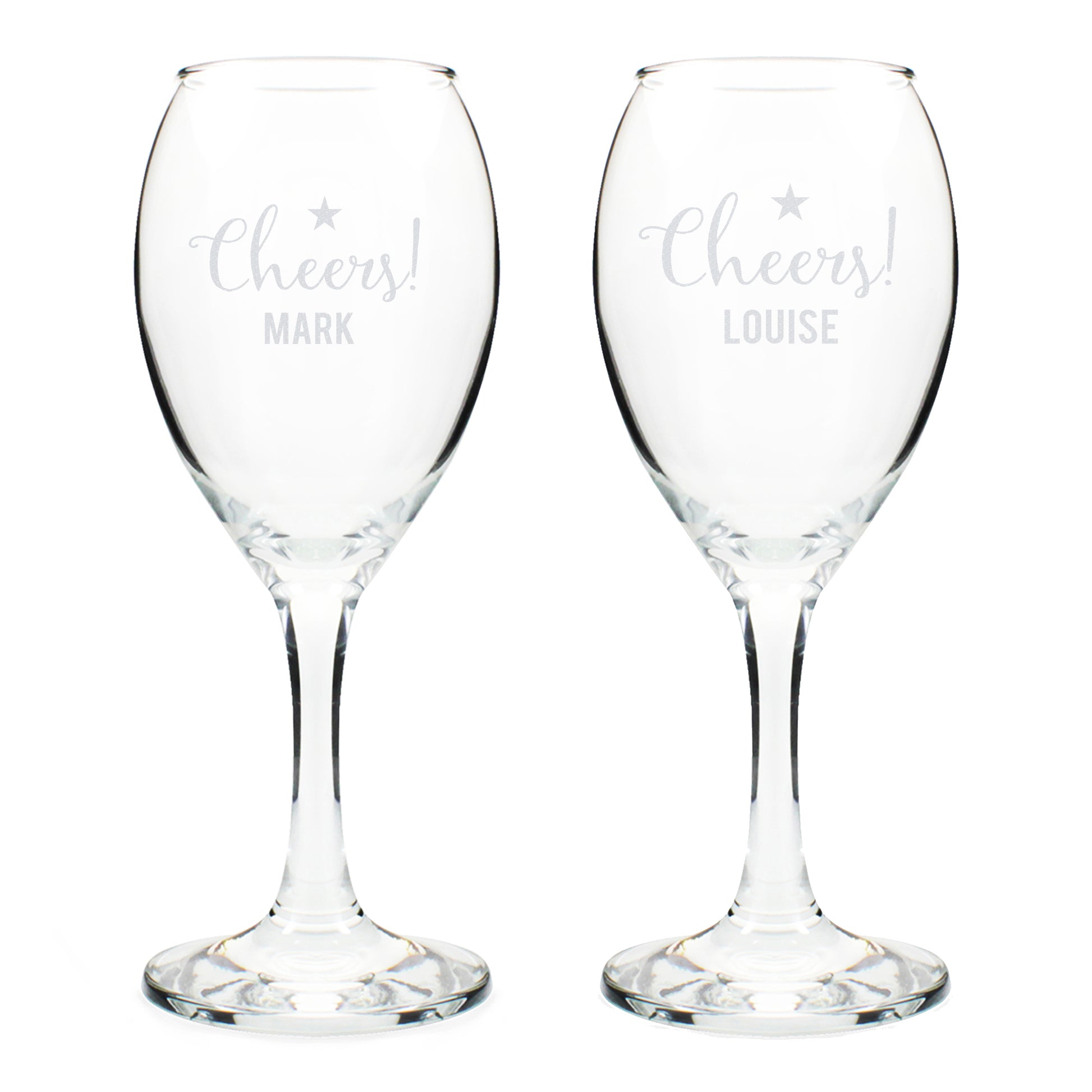 Both of these personalised Cheers Wine Glasses can be personalised with two names up to 12 characters each. One name will appear on each glass.