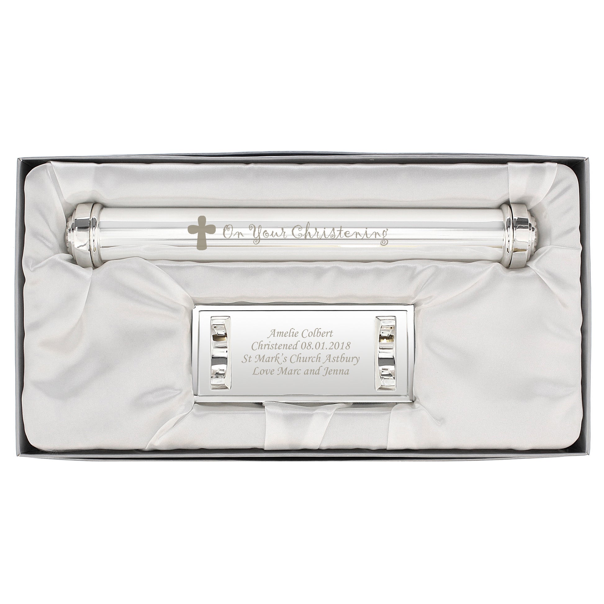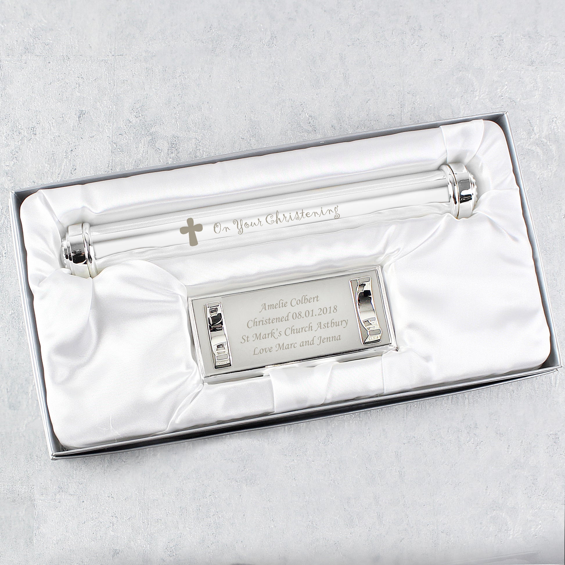 The wording 'On Your Christening' featured on the holder is fixed text.
