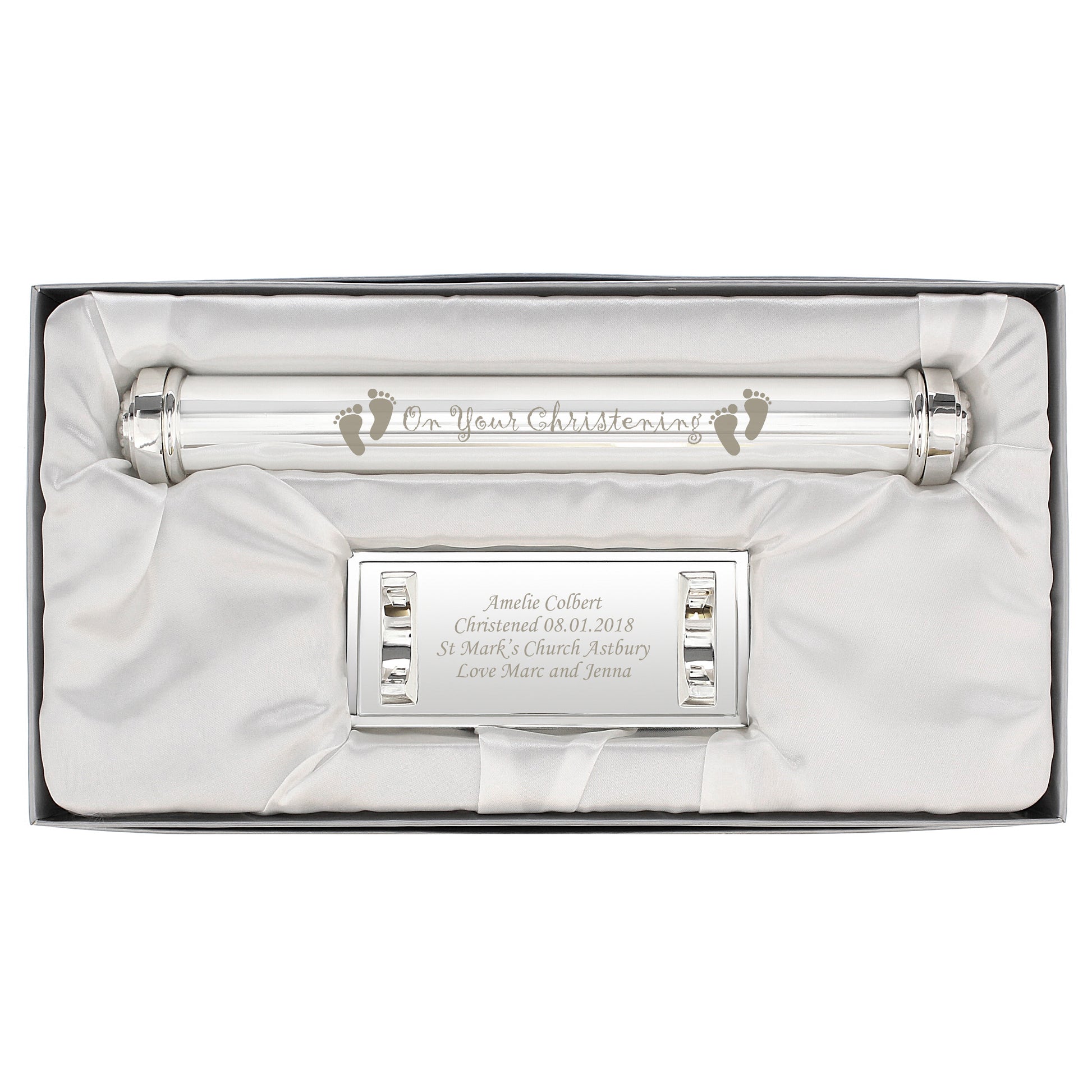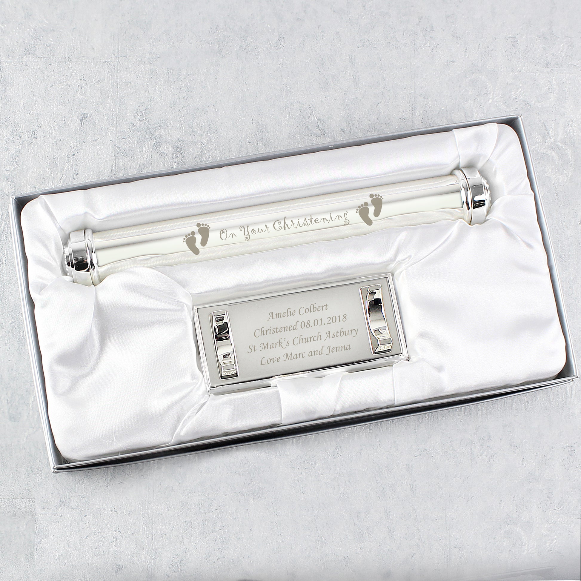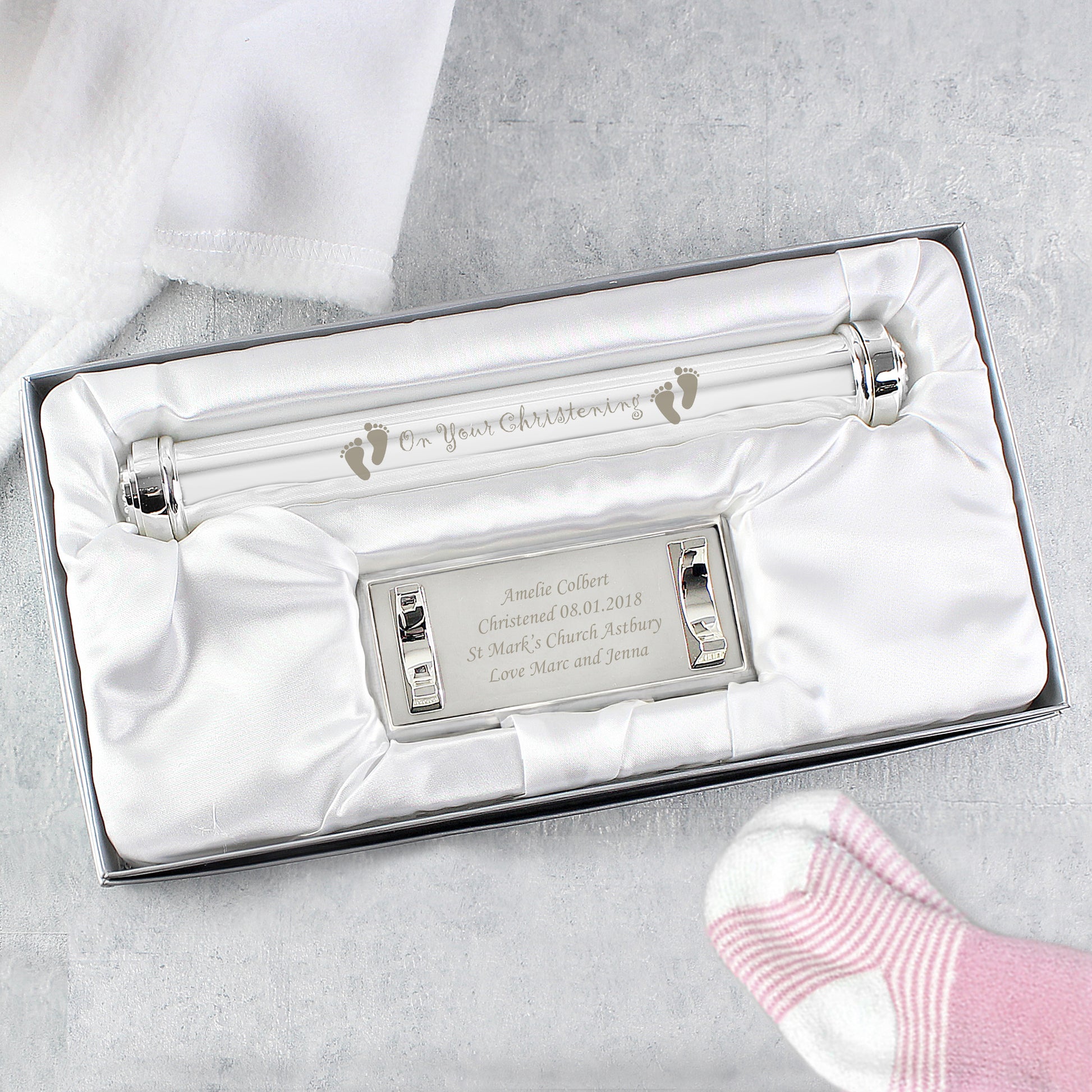 Personalised the stand with any message over 4 lines and up to 25 characters per line. The wording 'On Your Christening' featured on the holder is standard text.
