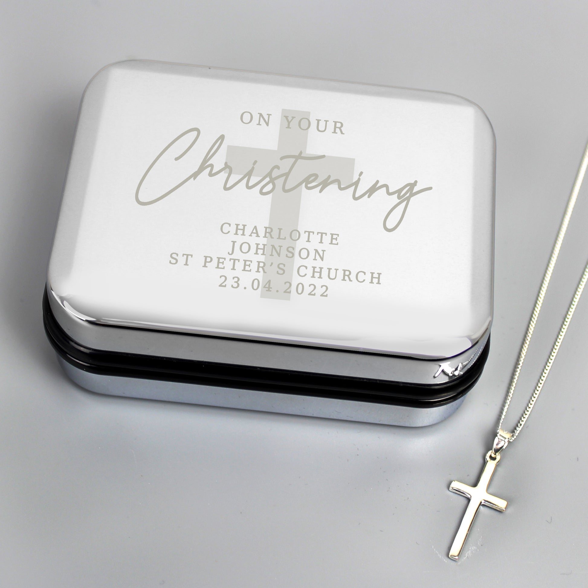 Personalised Christening Trinket Box & Sterling Silver Cross Necklace Set
