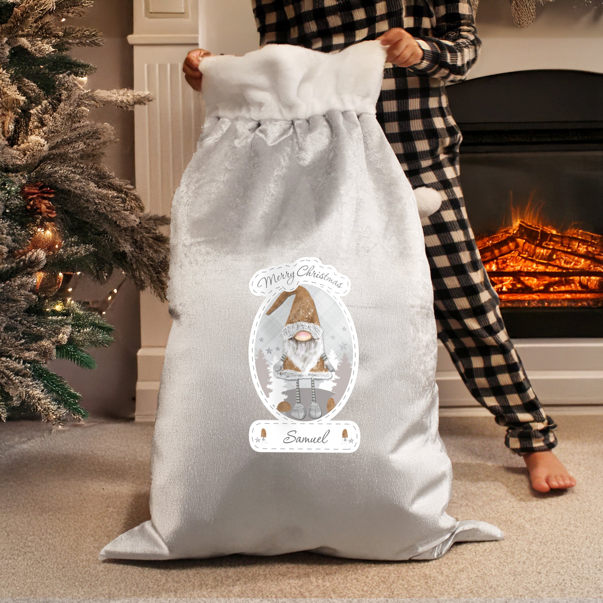 Personalised Christmas Gonk Luxury Silver Grey Pom Pom Sack