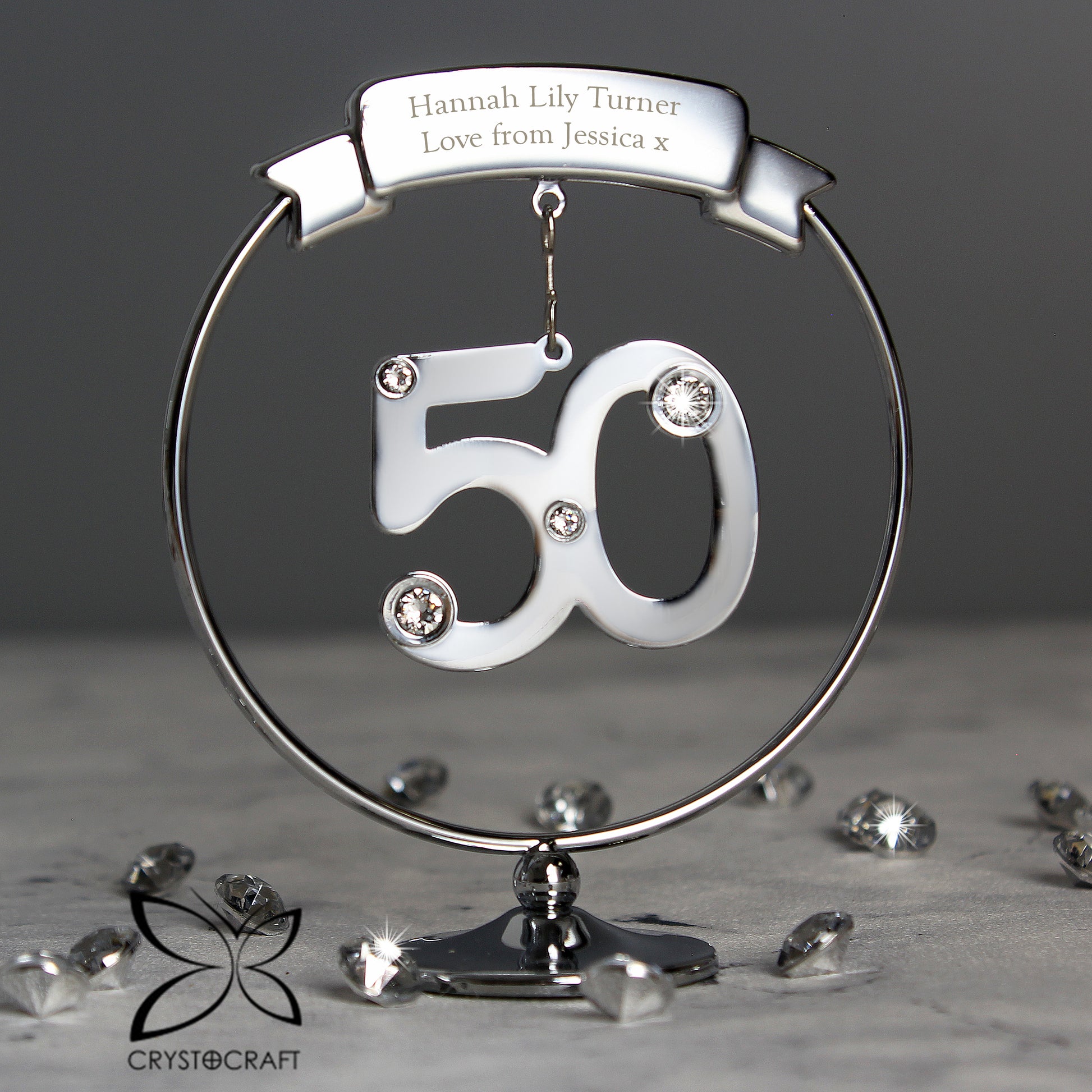 Mark their 50th Birthday or Wedding Anniversary with this elegant Crystocraft ornament. Dangling from a personalised round silver stand is a crystal clad 50. This will catch the light and bring a smile to the recipients face.