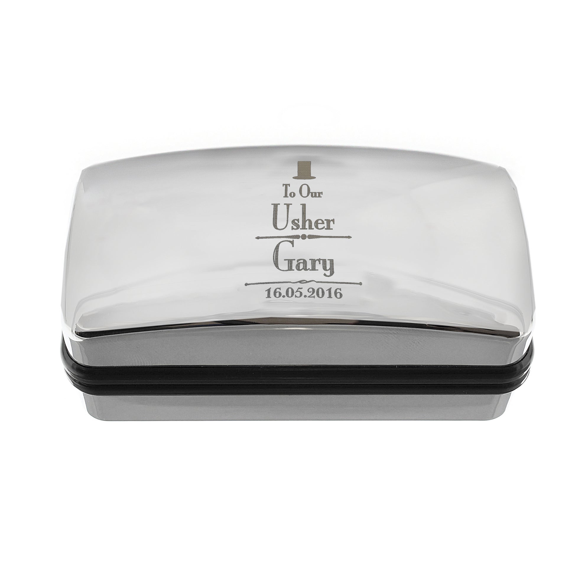 Personalise this Decorative Wedding Usher Cufflink Box with a name up to 12 characters and a date up to 15 characters.