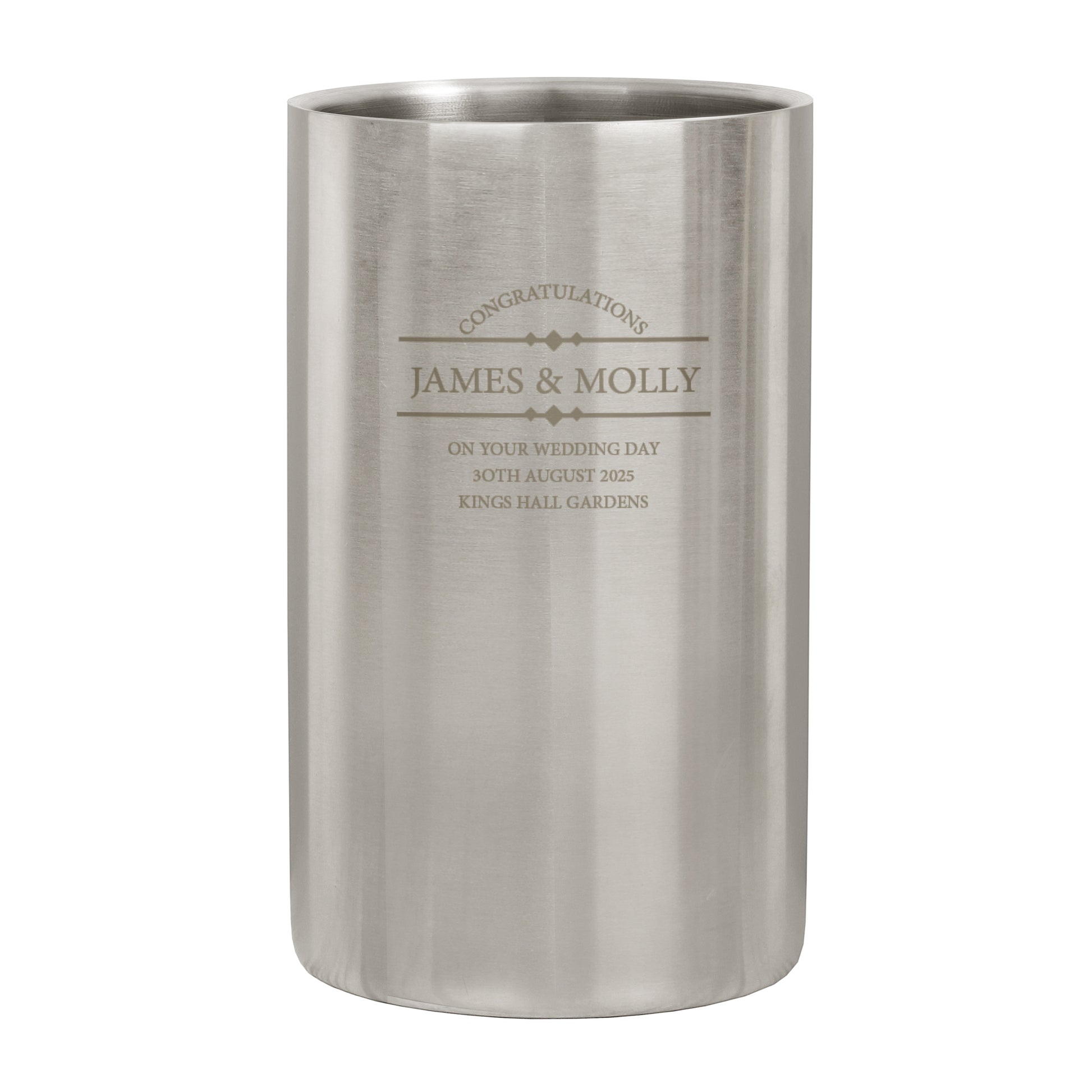Personalise this Diamond Stainless Steel Wine Cooler 1 line of text up to 15 characters (to appear at the top), 1 line of text up to 20 characters (appears in BOLD) and an additional 3 lines of text up to 30 characters.