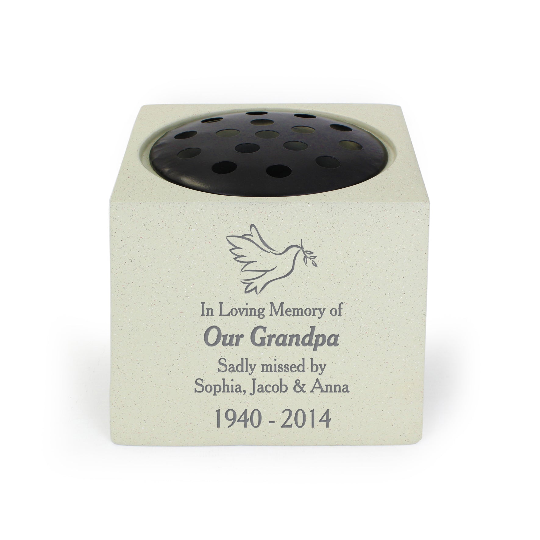Personalise this Dove Memorial Vase with 1 line up to 25 characters, a name or role up to 12 characters, and a further 3 lines of up to 20 characters for a message and a date.