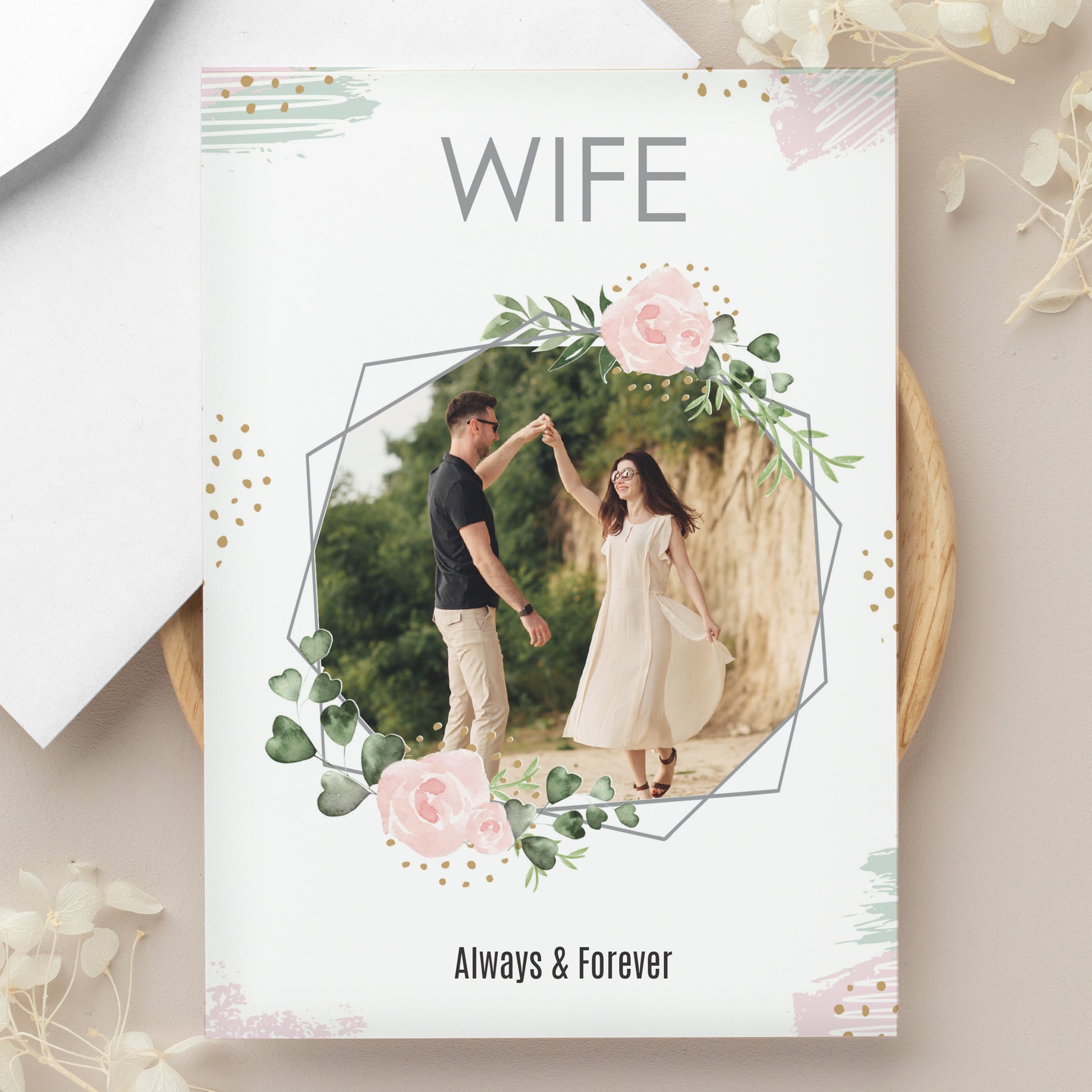 You can personalise this sweet card with your very own photograph to appear within the abstract floral design on the front.