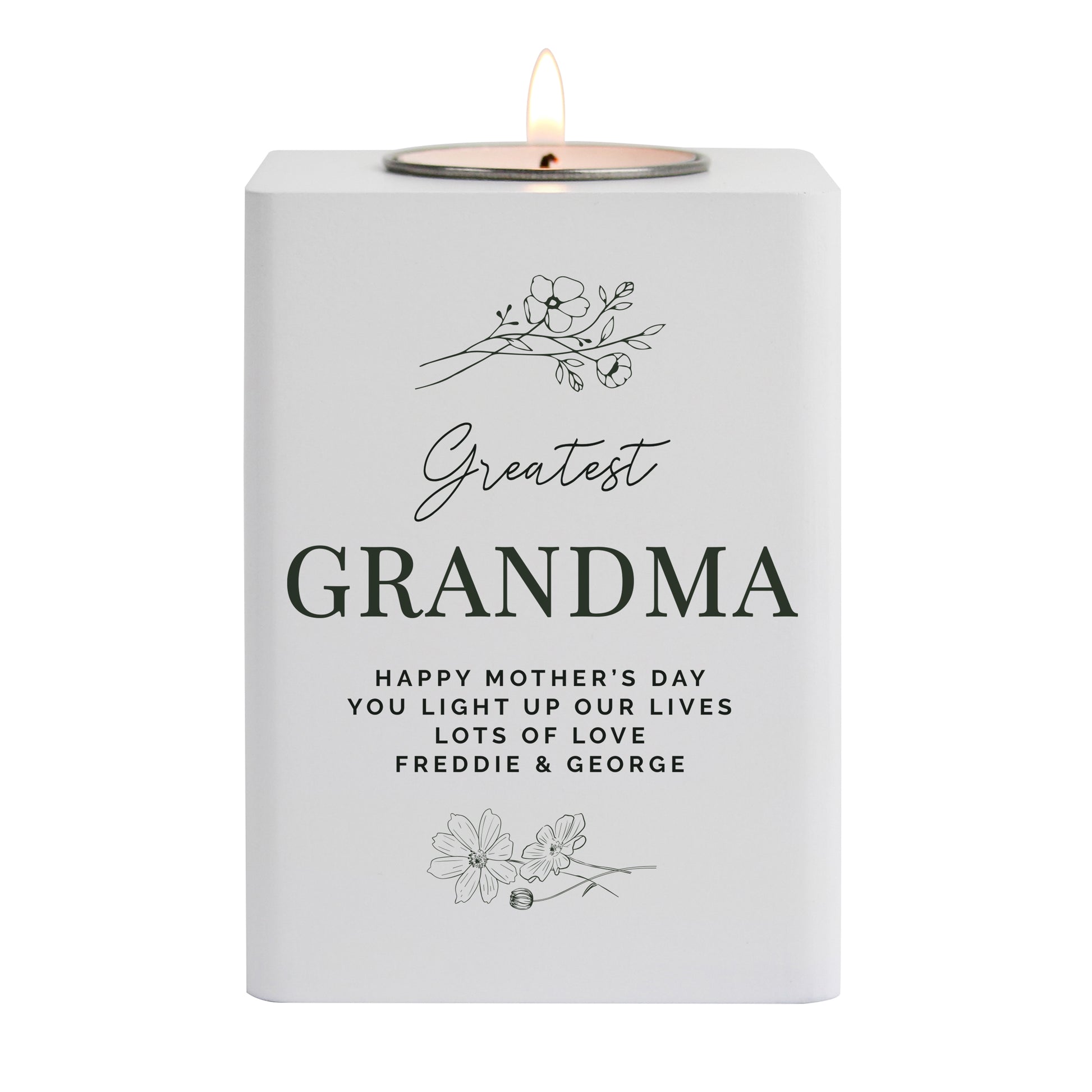 This gorgeous personalised white wooden tea light holder is a fantastic gift for Mother's Day.