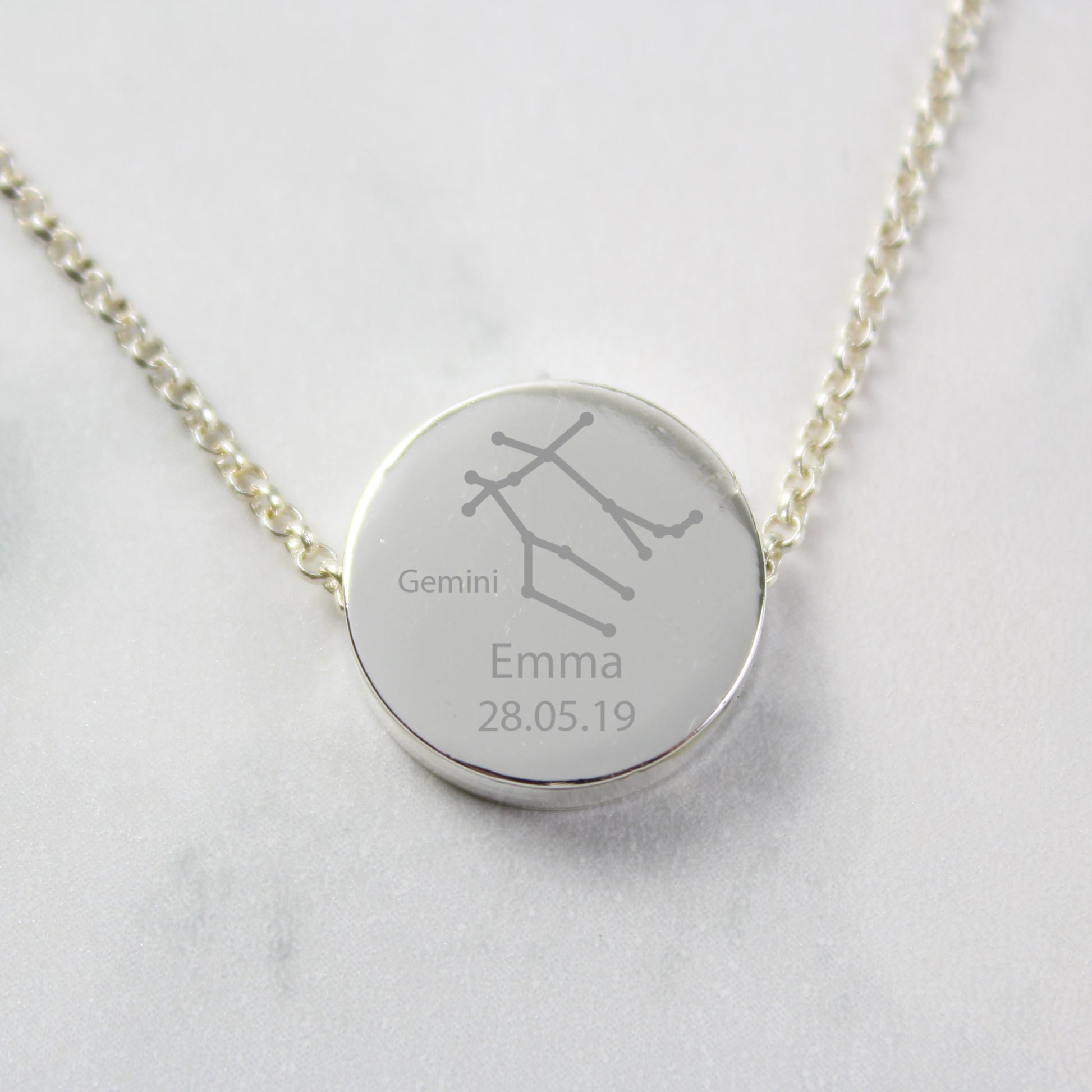 This Personalised Silver Tone Zodiac Gemini (May 21st-June 20th) Disc Necklace is a stylish and elegant gift for her that is suited to all occasions.