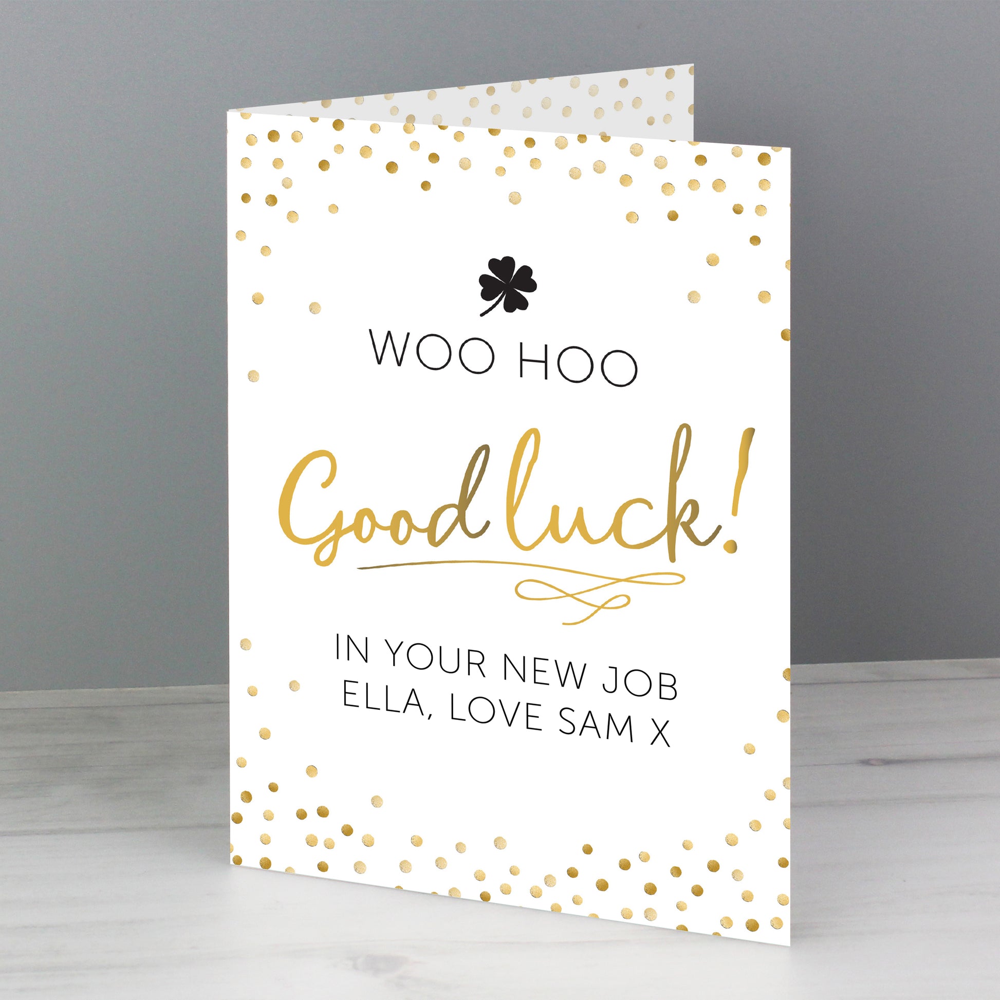 This bright modern design has the following fixed wording 'Woo Hoo' and 'Good Luck!' It also features a lucky shamrock icon.