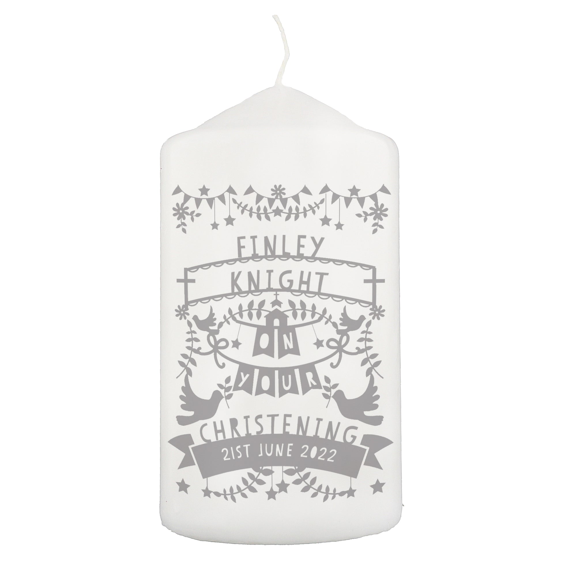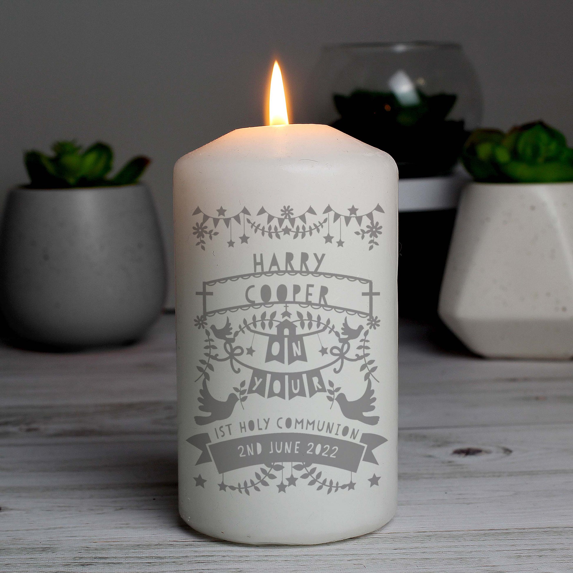 This Grey Paper Cut Pillar Candle is a gorgeous commemorative gift perfect for any religious occasion!