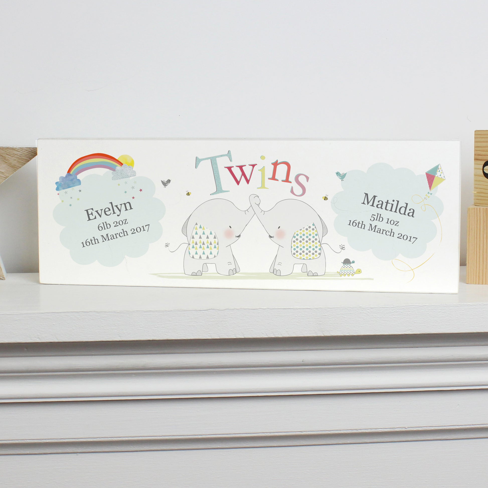 Personalised Hessian Elephant Twins Wooden Mantel Decoration