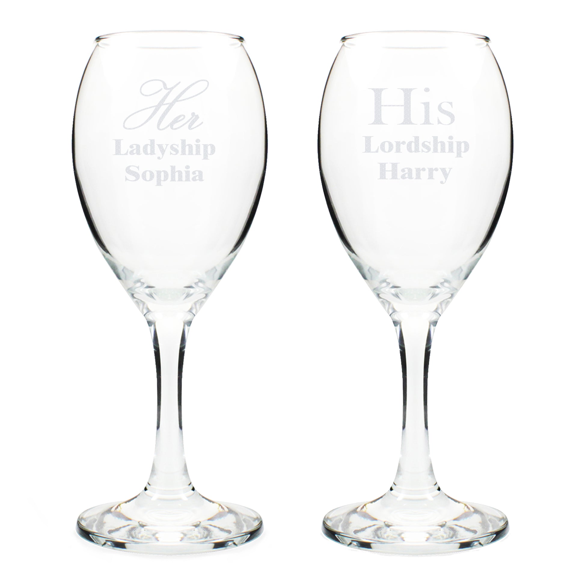 Both of these personalised His & Her Wine Glasses can be personalised with a name up to 12 characters long. Please note that the text His Lordship and Her Ladyship is fixed and cannot be amended.