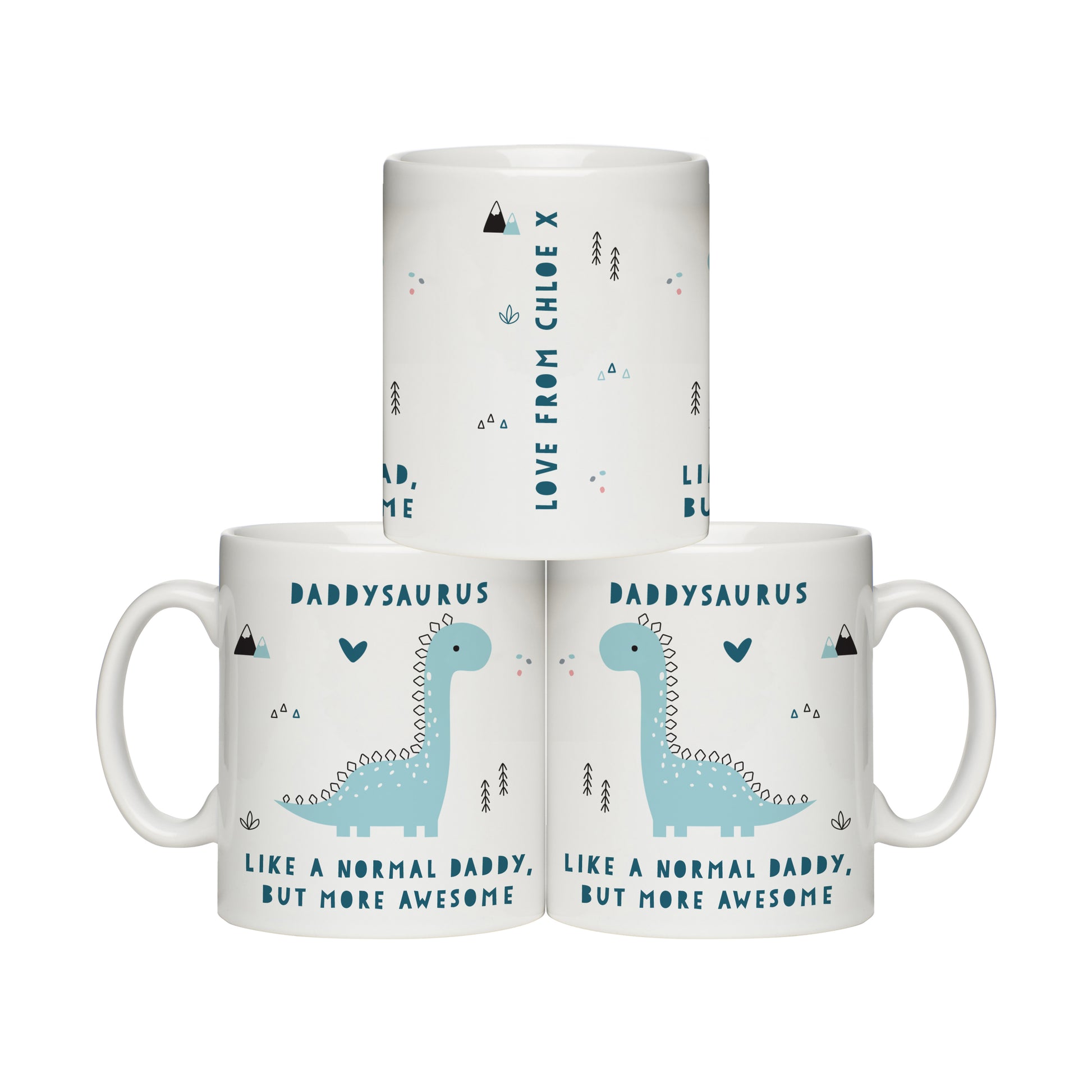 The title will appear at the top of the mug before the fixed text 'saurus' and again at the bottom in fixed text 'Like a normal {title} but more awesome'.