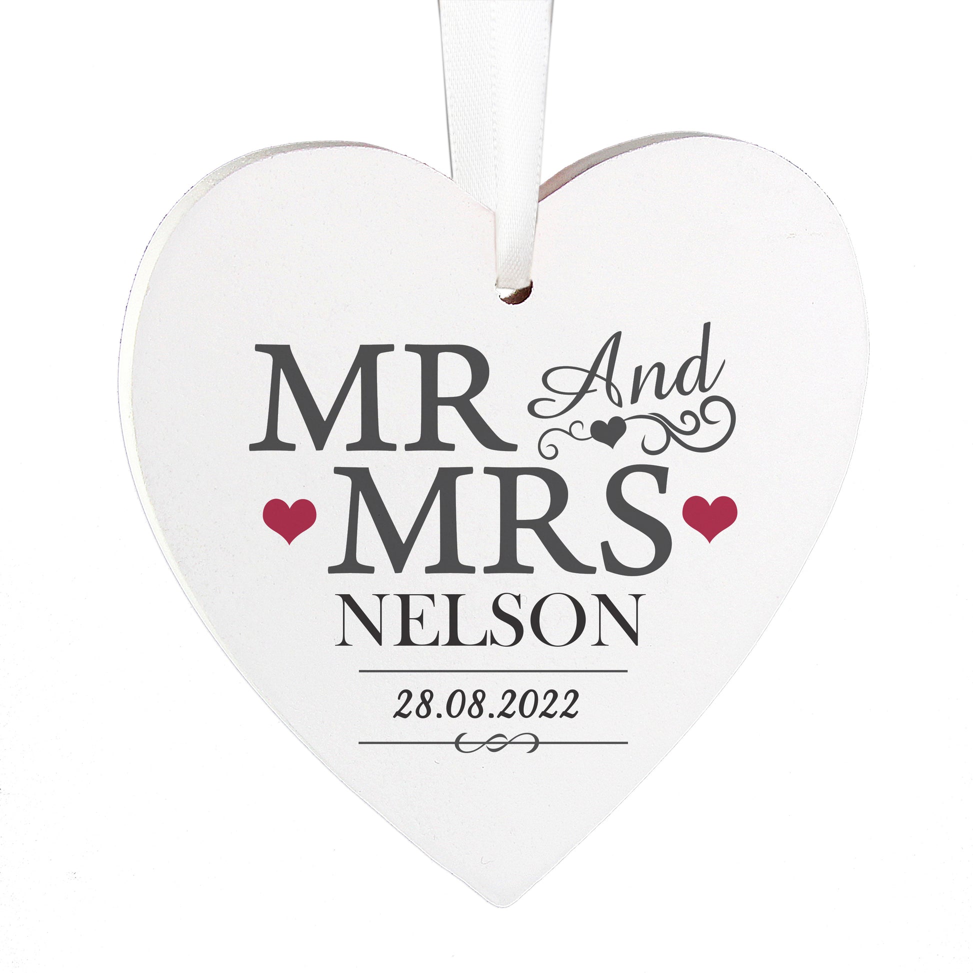 Personalise this Mr & Mrs Wooden Heart Decoration with a couples surname up to 15 characters and date up to 20 characters..