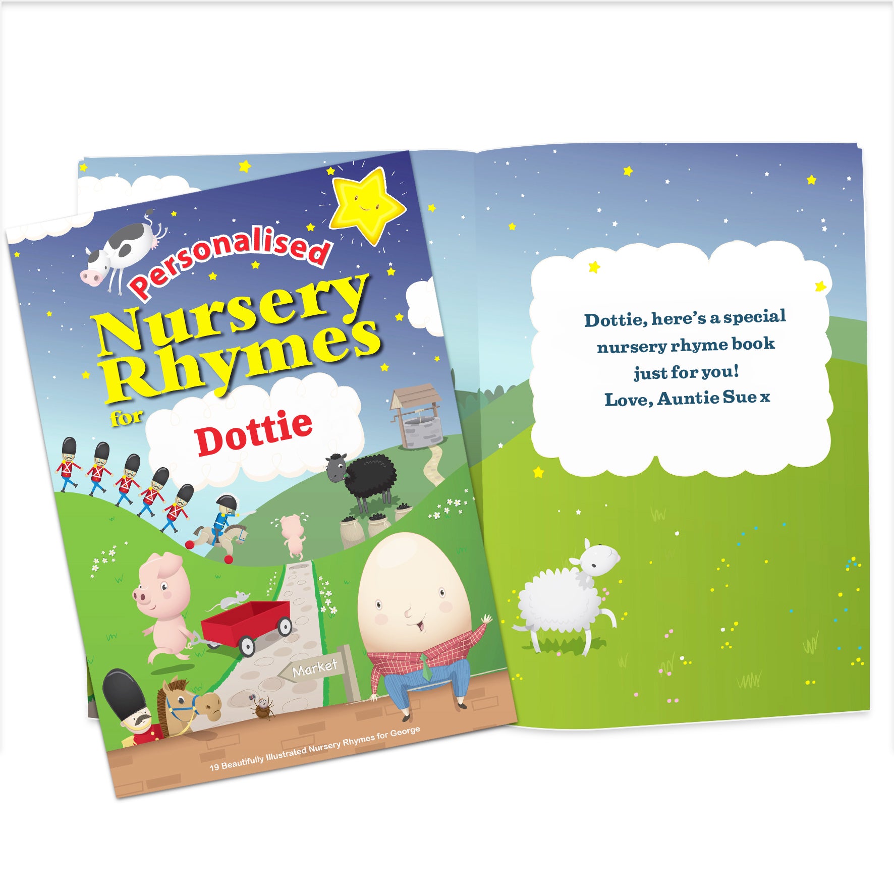 Our personalised Nursery Rhyme Book contains 19 beautifully illustrated popular nursery rhymes, each personalised with a child's name, making it a perfect gift for a 1st Birthday, Christmas, New Borns and Christenings. The bright and colourful illustrations are sure to inspire their imaginations and provide hours of fun!