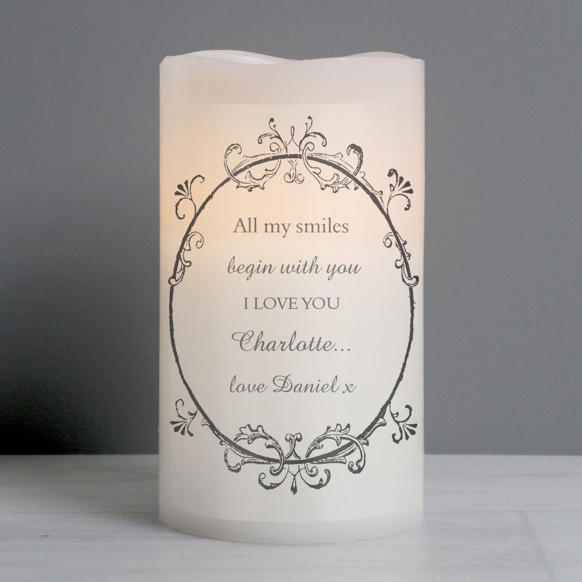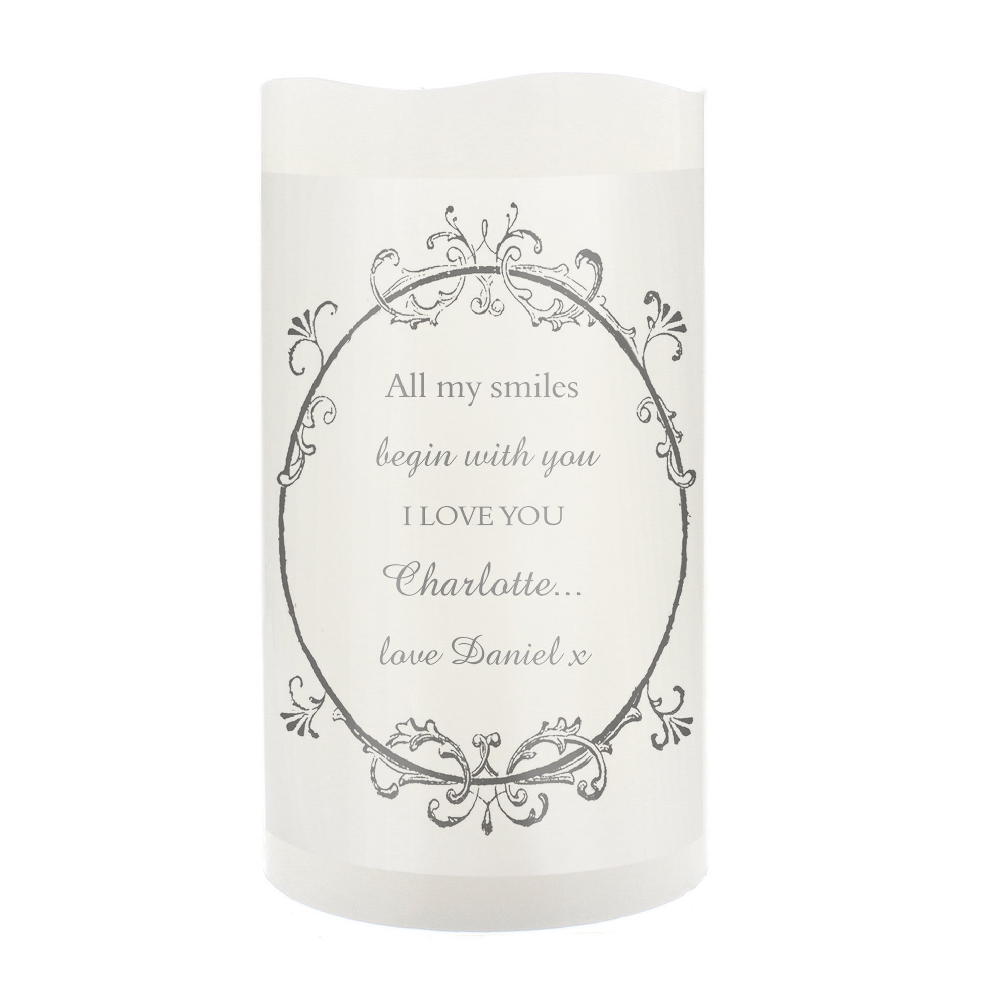 Personalise the Ornate Frame LED candle with up to 5 lines of 20 characters of personalisation.