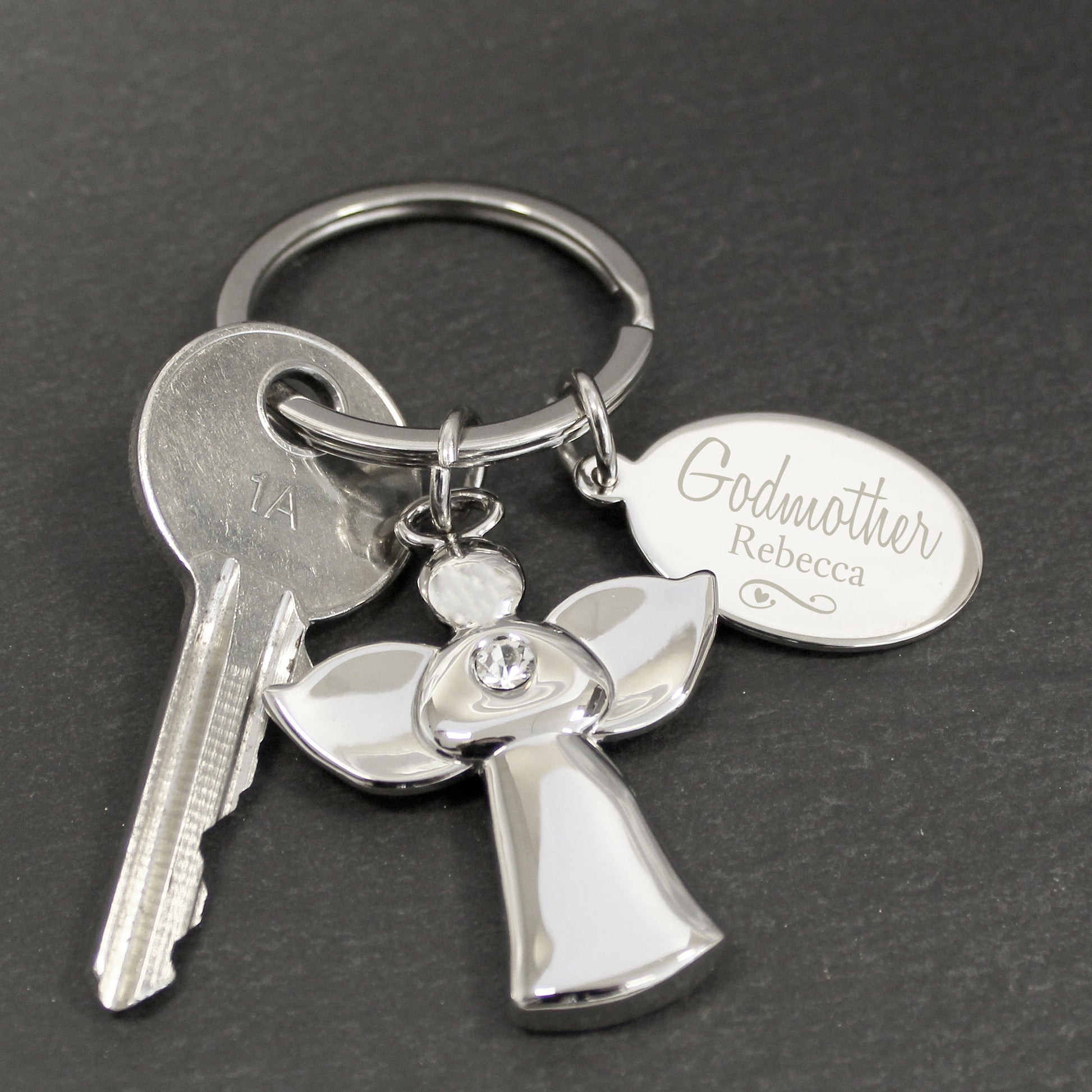 Personalised Silver Plated Swirls & Hearts Godmother Angel Keyring