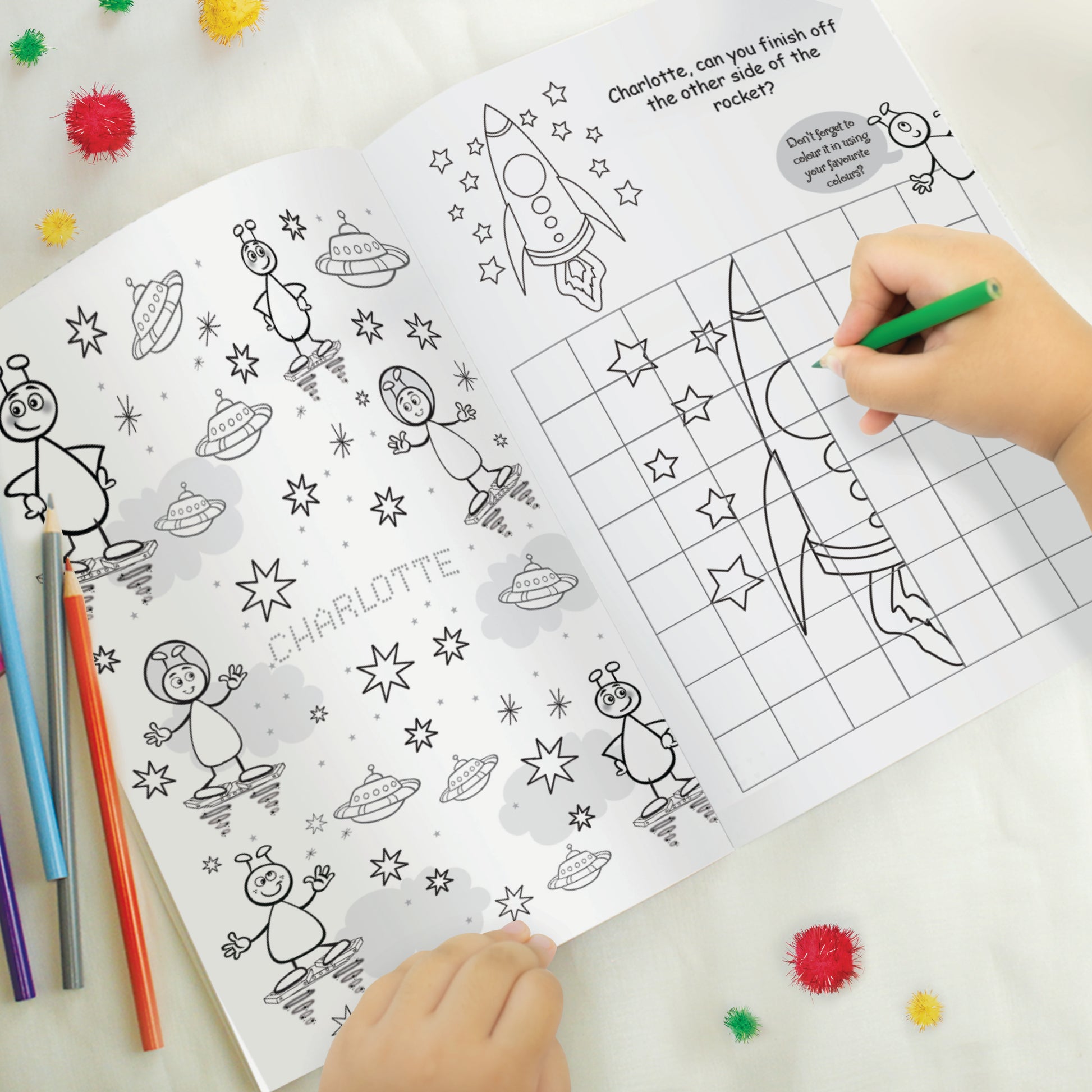 A fantastic gift for any child with an active imagination, this personalised space themed colouring book features the child's name on the front cover and throughout the colouring book.