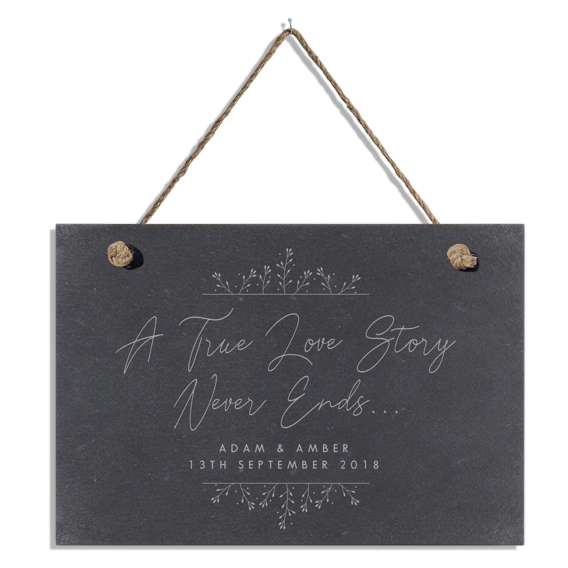 The beautiful phrase "A True Love Story Never Ends" stands proud in the centre of the sign and your unique message is engraved below.