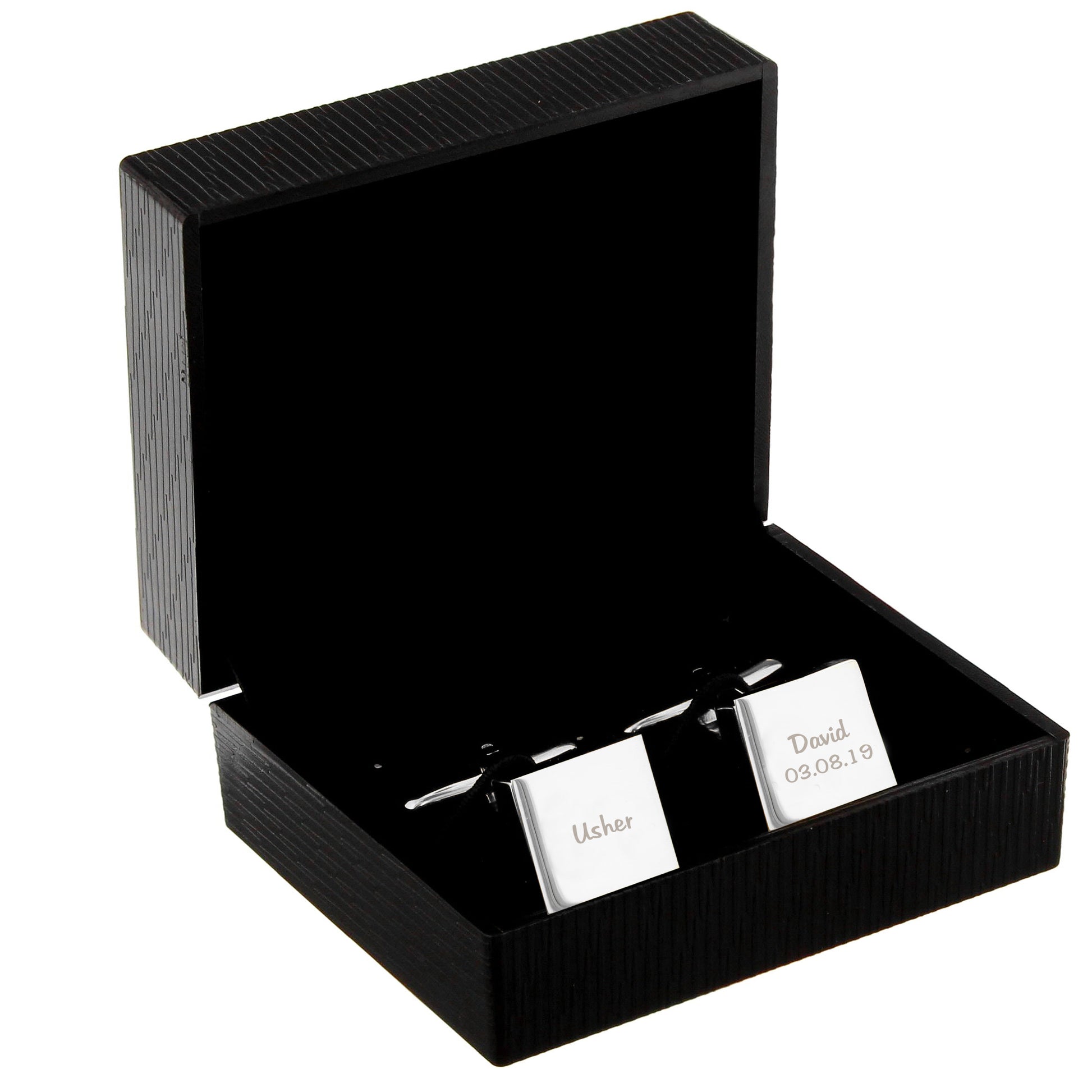 Personalise these cufflinks with a line of 10 characters on the first cufflink. You can add 2 lines of 10 characters on the second cufflink, ideal for adding a name and a special date.